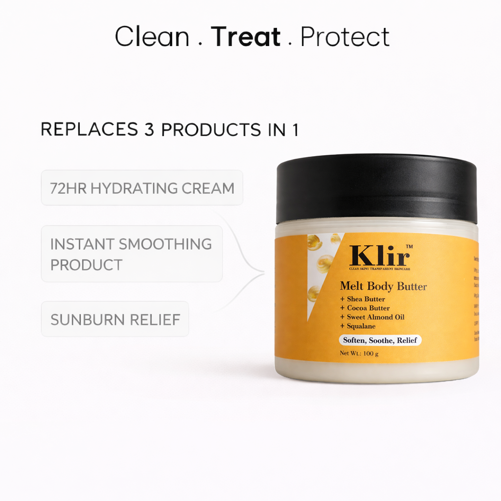 KLIR Melt Body Butter is a rich, melt-in moisturizer designed to deeply nourish very dry skin and restore long-lasting softness. Formulated with Shea Butter, Cocoa Butter, and Mango Butter, it delivers intense moisture while Squalane and Vitamin E help support the skin barrier and prevent moisture loss.