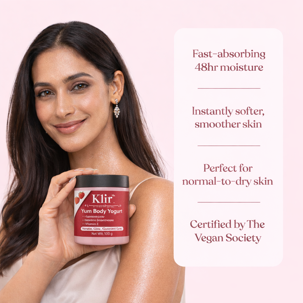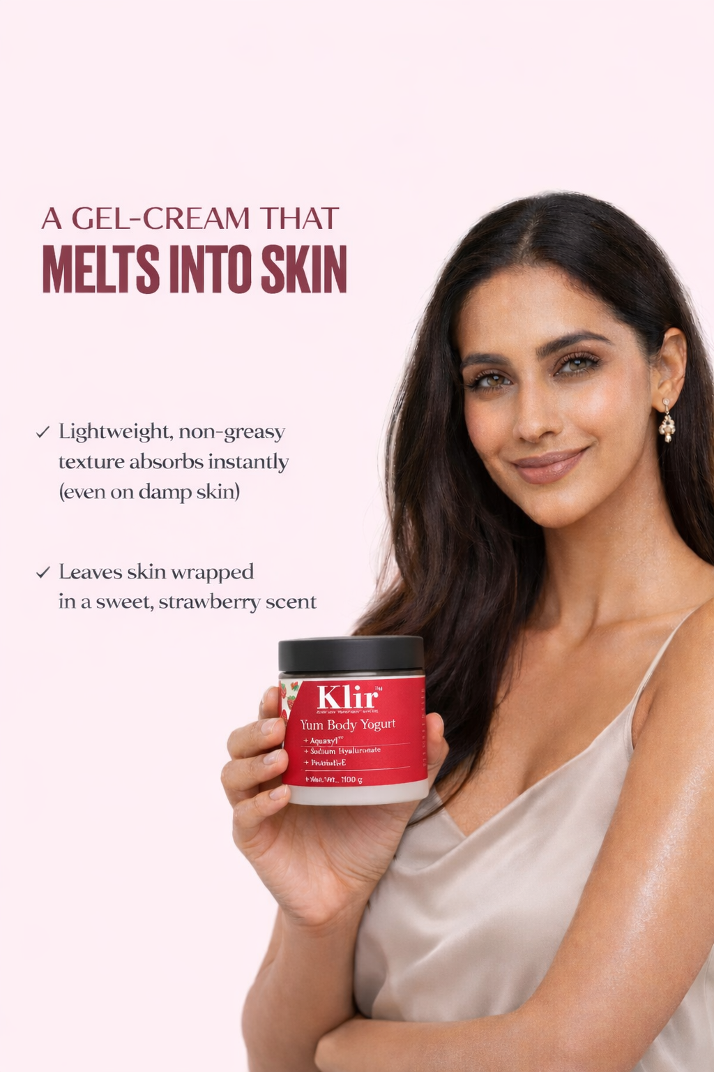 KLIR Yum Body Yogurt is a lightweight, fast-absorbing body moisturizer designed to deliver instant hydration without heaviness. Powered by Aquaxyl™, Hyaluronic Acid, and Probiotics, it deeply hydrates, supports the skin barrier, and leaves skin soft, smooth, and refreshed.